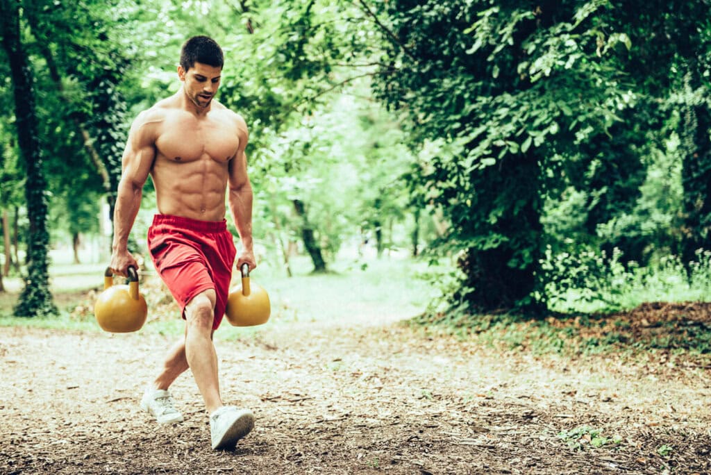 - Kettlebells com revestimento em borracha — Evitam danos no pavimento e permitem uma grande variedade de exercícios balísticos ao ar livre.